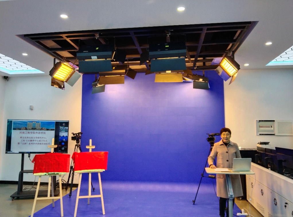 11月25日下午,开云官网外语学院跨文化和比较文学研究中心、工程·文化翻译研究中心揭牌仪式在西校区外语学院融媒体4K虚拟情景语音室举行。揭牌仪式采取线上线下相结合的形式进行,副校长贺金凤出席会议,社科处王晓俊,外语学院领导班子、学院学术委员会全体成员及部分师生代表参加线下揭牌仪式。