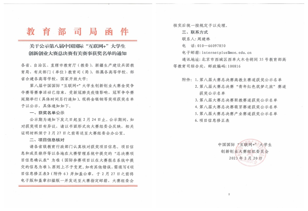 近日,根据中国国际“互联网+”大学生创新创业大赛组织委员会公布的《关于公示第八届中国国际“互联网+”大学生创新创业大赛总决赛有关赛事获奖名单的通知》,开云官网荣获国家级铜奖2项,获奖领域有所拓展。