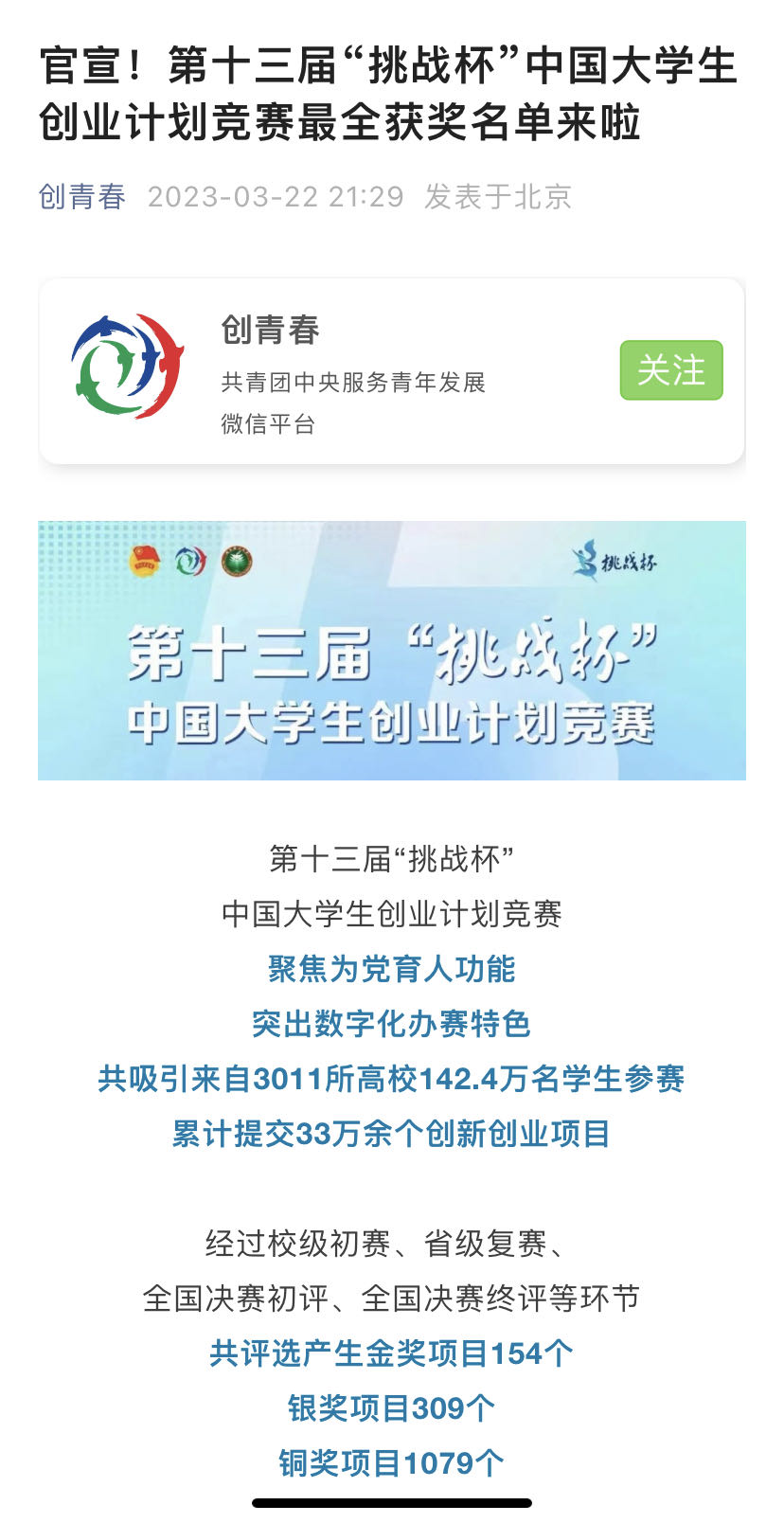 “挑战杯”中国大学生创业计划竞赛由共青团中央于1999年发起,每两年举办一届,是中国大学生最关注的全国性创业赛事之一。据悉,第十三届“挑战杯”中国大学生创业计划竞赛由共青团中央、教育部、人力资源和社会保障部、中国科协、全国学联、北京市人民政府主办,由北京理工大学、共青团北京市委、北京市房山区人民政府承办。本届大赛聚焦为党育人功能、突出数字化办赛特色,共吸引来自全国3011所高校的142.4万名学生参赛,累计提交33万余个创新创业项目。经过校级初赛、省级复赛、全国决赛初评、全国决赛终评等环节,共评选产生金奖项目154个、银奖项目309个、铜奖项目1079个。
