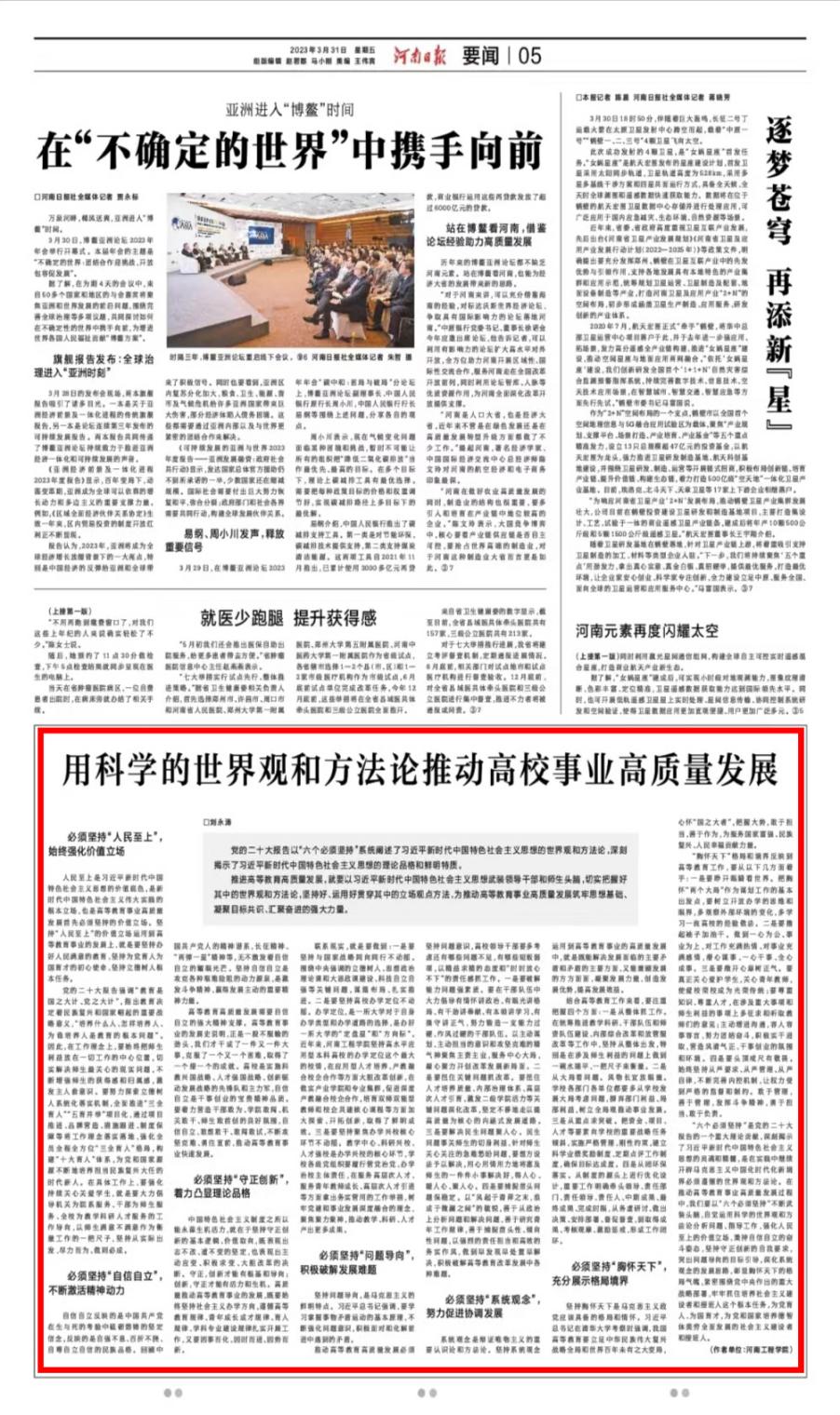 3月31日,《河南日报》第05版以《用科学的世界观和方法论推动高校事业高质量发展》为题,刊发开云官网党委书记刘永涛的理论文章。文章坚持理论和实际相结合,就如何深入学习贯彻党的二十大精神,推动高校事业高质量发展进行了系统阐述。