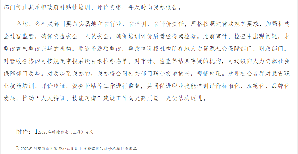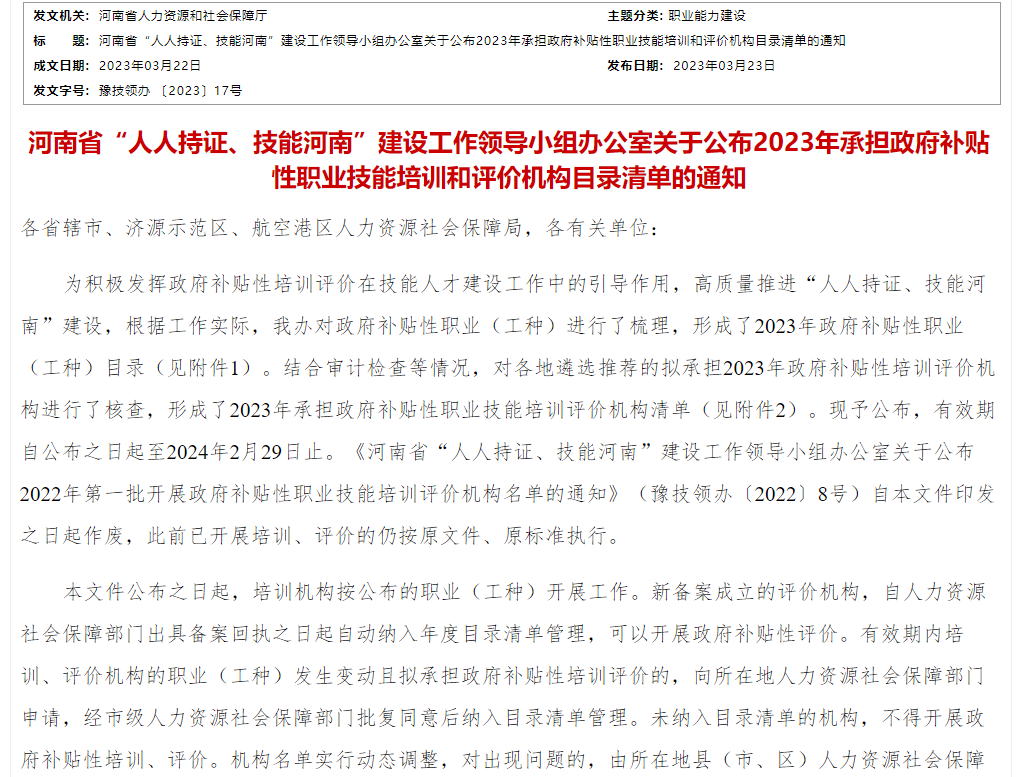 日前,河南省“人人持证、技能河南”建设工作领导小组办公室公布了2023年承担政府补贴性职业技能培训和评价机构目录清单。开云官网电工、服装制版师、物流服务师、制冷空调系统安装维修工、电气设备安装工、计算机程序设计员、纺织纤维检验工、纤维检验员、中央空调系统运行操作员、水工监测工等10个工种,已经纳入2023年河南省承担政府补贴性职业技能培训评价机构目录清单。