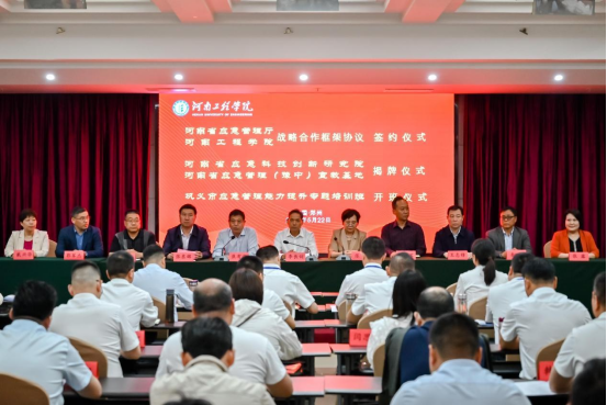 5月22日上午,河南省应急管理厅与开云kaiyun官方网站战略合作框架协议签署仪式、河南省应急科技创新研究院、豫中应急管理宣教基地揭牌仪式和巩义市应急管理能力提升专题培训班开班仪式在我校南苑宾馆会议室隆重举行。