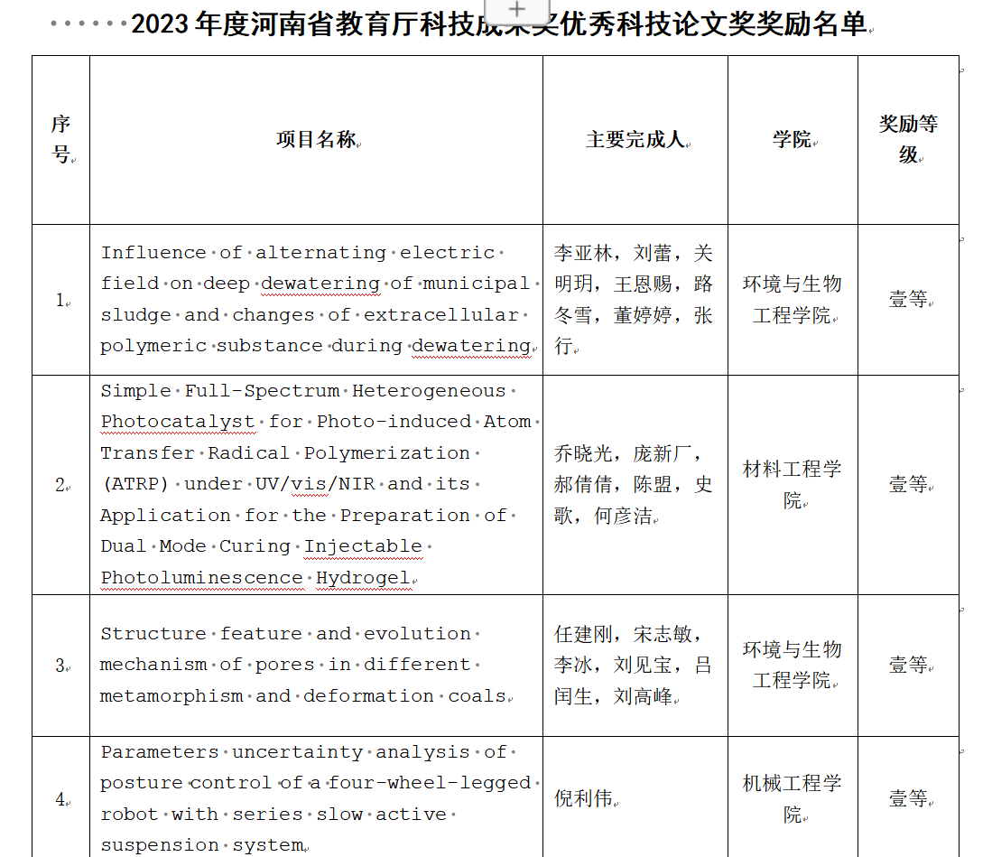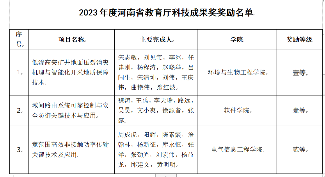 近日,河南省教育厅印发《关于公布2023年度科技成果奖奖励名单的通知》(教科技〔2023〕185号),公布2023年度科技成果奖和优秀科技论文奖获奖名单,开云官网2项成果荣获河南省教育厅科技成果奖一等奖,1项成果荣获河南省教育厅科技成果奖二等奖; 6篇论文荣获河南省教育厅优秀科技论文奖一等奖, 14篇论文荣获河南省教育厅优秀科技论文奖二等奖。