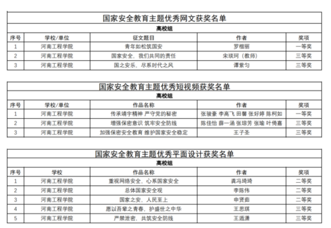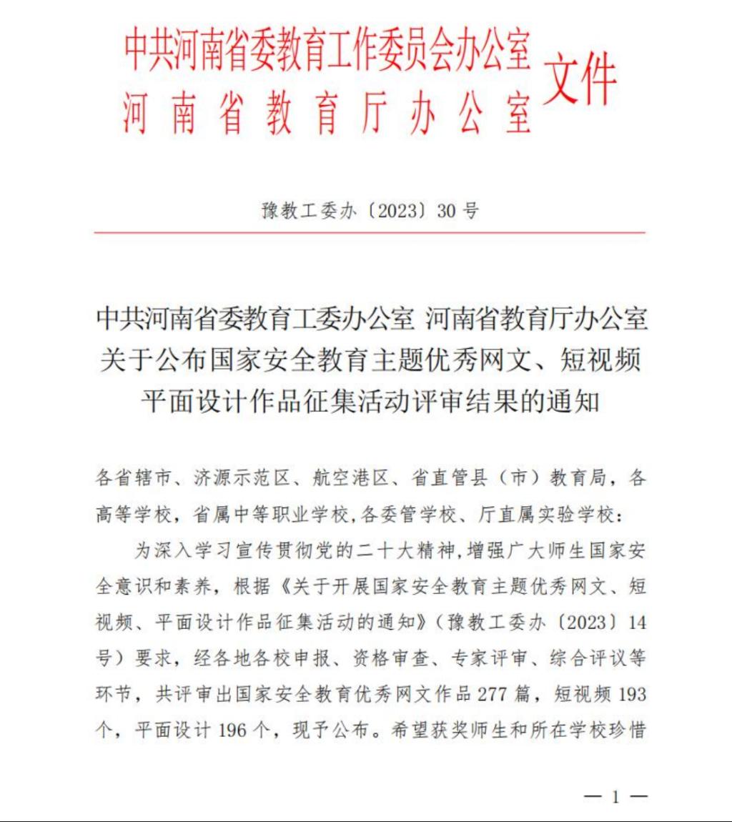 近日,省委教育工委办公室、省教育厅办公室公布了国家安全教育主题优秀网文、短视频、平面设计作品征集活动评审结果,开云官网在优秀网文、短视频、平面设计等各个项目中均获奖。