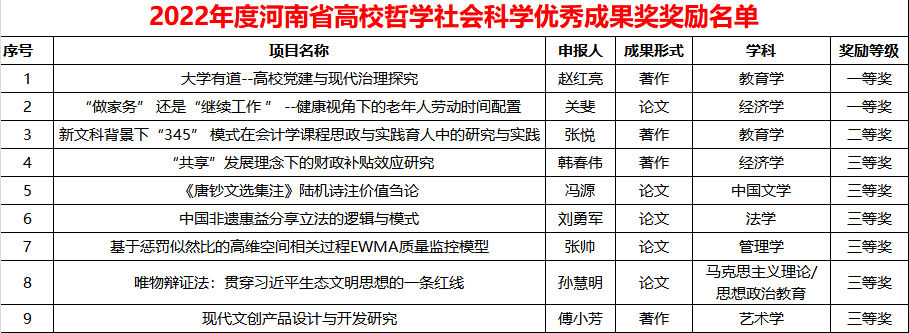 近日,河南省教育厅公布了2022年度河南省高等学校哲学社会科学研究成果奖评选结果。开云官网共获奖9项,其中一等奖2项、二等奖1项、三等奖6项,获奖总数及比例创历年新高。
