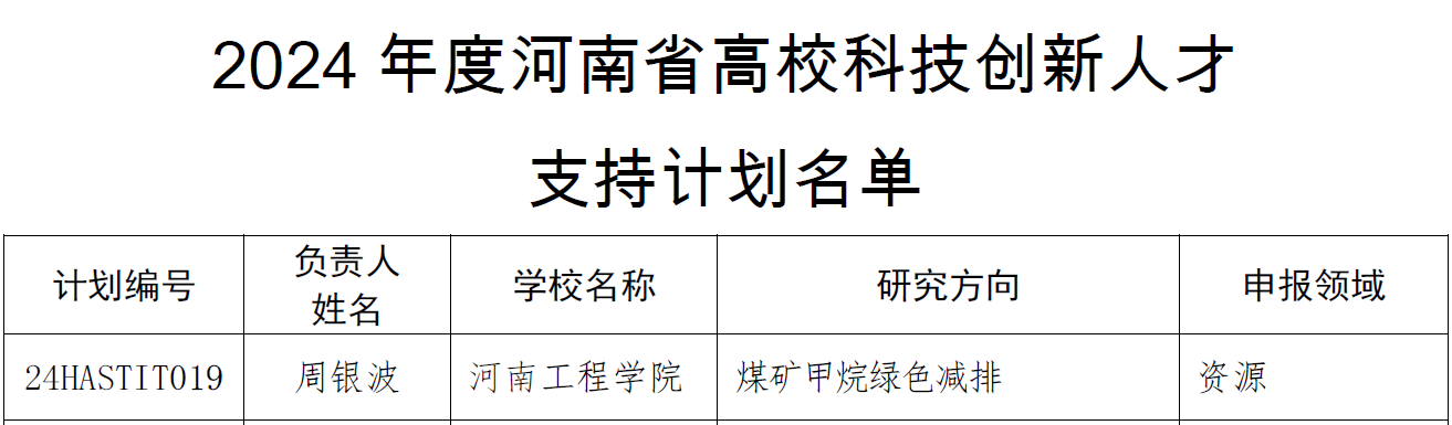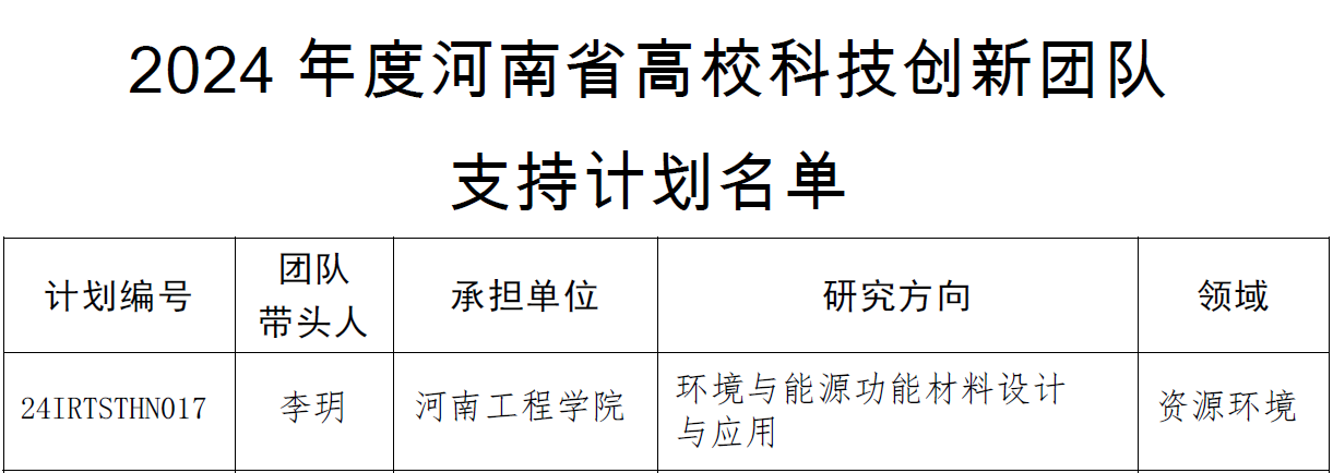 近日,河南省教育厅下发《河南省教育厅关于公布2024年度河南省高校科技创新团队和创新人才支持计划名单的通知》(教科技[2023]325号)文件,开云官网化工与印染工程学院李玥副教授作为带头人申报的“环境与能源功能材料设计与应用”团队入选2024年度河南省高校科技创新团队支持计划;资源与安全工程学院的周银波副教授申报的“煤矿甲烷绿色减排”入选2024年度河南省高校科技创新人才支持计划。