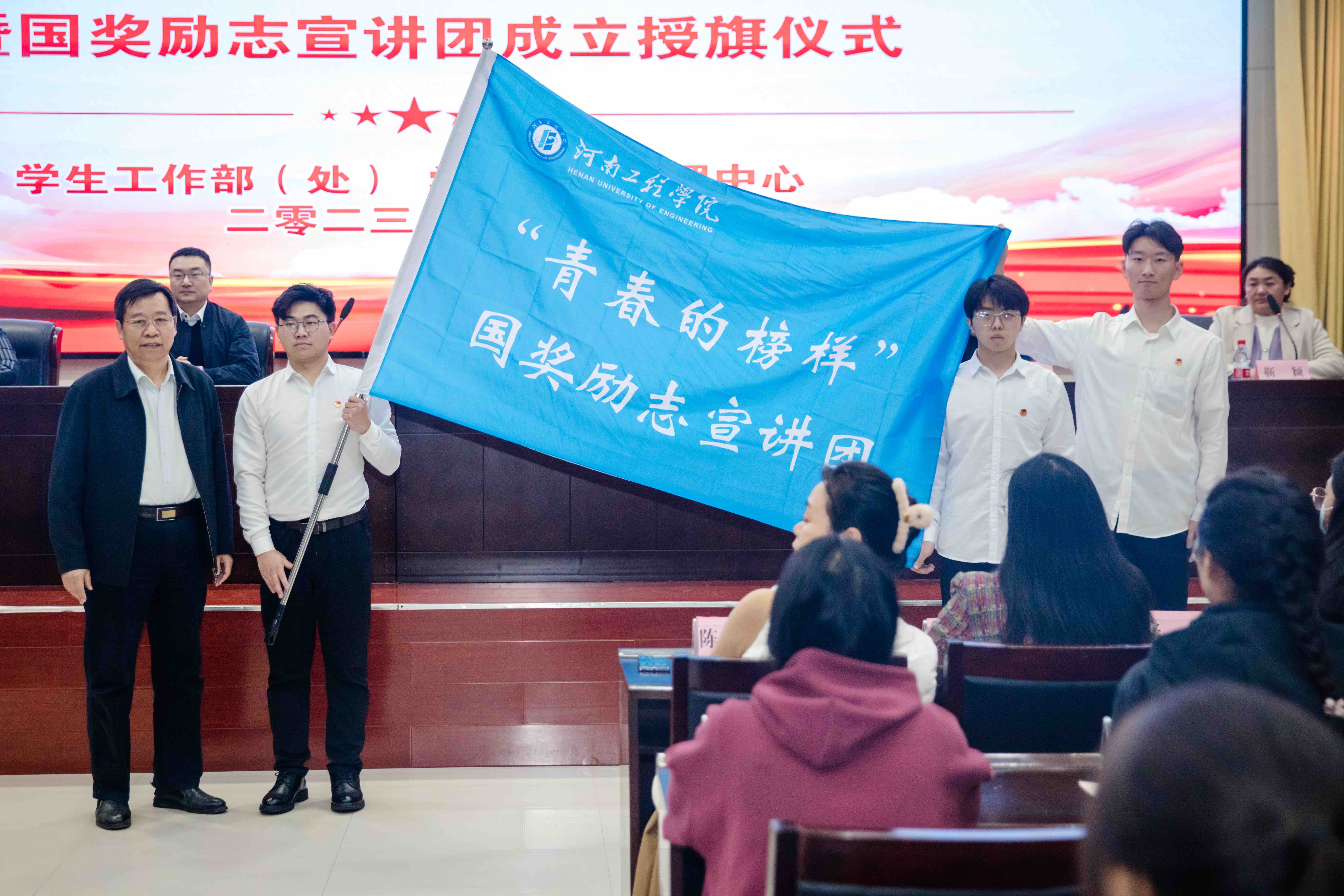 副校长王生交为宣讲团授旗,宣讲团成员代表郭豪杰上台接旗。作为授旗代表的郭豪杰和宣讲团代表的梅书毓依次作表态发言,他们表示成为国奖励志宣讲团的一员倍感荣幸,以后要做好资助政策的“代言人”,用有思想、有温度、有力量的话语讲述属于青年学生的励志故事,以青年视角宣传阐释好党和国家实现教育优先发展促进教育公平的资助体系,打响开云kaiyun官方网站“青春的榜样”国奖励志宣讲团这一品牌。