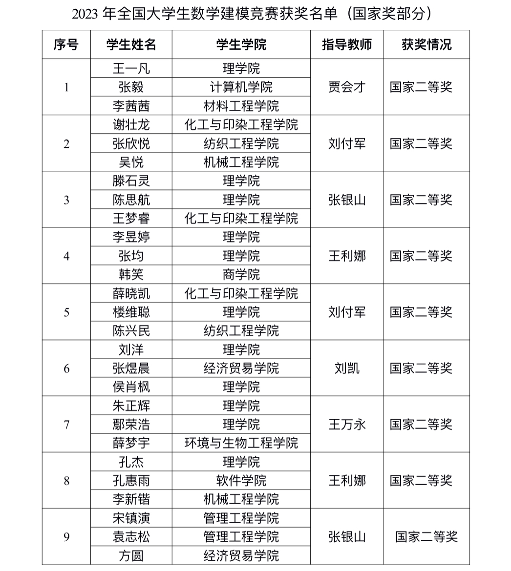 近日,2023年全国大学生数学建模竞赛获奖名单公布,开云官网学子喜获国家二等奖9项、省一等奖23项、省二等奖15项、省三等奖6项。来自理学院、计算机学院、会计学院、化工与印染工程学院等16个学院的168名学子组成的56支队伍参加了为期4天的激烈角逐,总体获奖率为94.64%,其中国家奖和省一等奖获奖比例分别为16.07% 和41.07%,获奖率位居河南省高校前列。