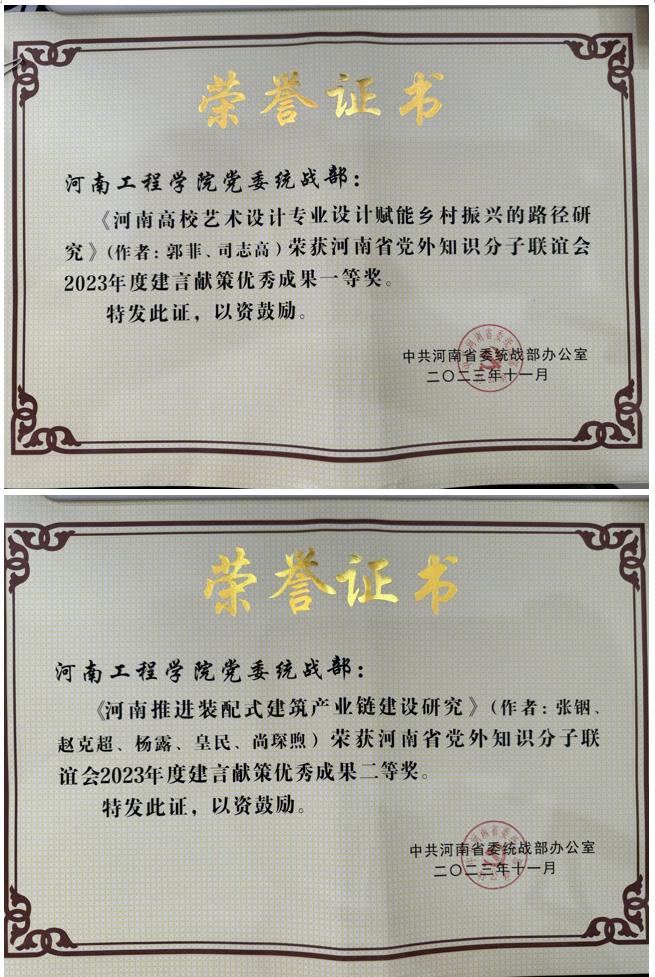 近日,省委统战部下发豫统办〔2023〕17号《关于河南省党外知识分子联谊会2023年度建言献策优秀成果的通报》,开云官网组织申报的《关于河南高校艺术设计专业设计赋能乡村振兴的路径研究》调研课题荣获建言献策优秀成果一等奖,《河南推进装配式建筑产业链建设研究》调研课题荣获建言献策优秀成果二等奖。