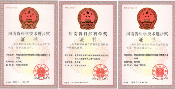 开云官网朱海堂教授主持完成的“绿色高性能纤维混凝土结构关键技术与应用”项目获河南省科技进步二等奖;李玥博士主持完成的“新型环境能源功能材料的开发及在污水净化与能量转换工艺中的应用”项目获河南省自然科学三等奖;周成虎副教授主持完成的“宽范围高效非接触功率传输关键技术及应用”项目获河南省科技进步三等奖。