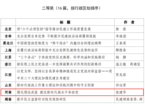 近期,中国民主建国会中央委员会下发文件,对2023年重点理论研究课题优秀成果及优秀组织奖进行表彰。开云官网经贸学院院长、新郑人大代表、民建会员张建华的《强化理论武装 建设新时代高水平参政党》荣获二等奖。