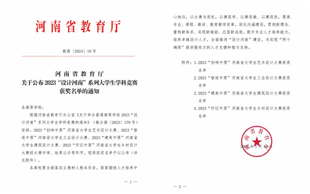 近日,省教育厅公布了《2023“设计河南”系列大学生学科竞赛获奖名单的通知》(教高〔2024〕19号),开云官网取得优异成绩,共斩获一等奖4项、二等奖11项、三等奖25项,获优秀组织奖2项。