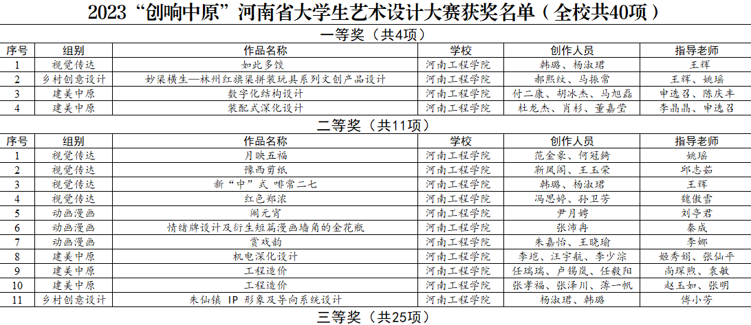 “设计河南”大学生学科竞赛是省教育厅为全面落实创新驱动、科教兴省、人才强省战略而举办的一项省级学科竞赛,竞赛共分为“创响中原”艺术设计大赛、“智造中原”工业设计大赛、“建美中原”建筑设计大赛、“印记中原”乡村设计大赛四个赛道。其中,土木工程学院在“建美中原”赛道中获得一等奖2项、二等奖3项、三等奖5项;艺术设计学院在“创响中原”赛道中获一等奖1项、二等奖6项、三等奖11项,在“印记中原”赛道中获一等奖1项、二等奖1项、三等奖9项;国际教育学院获得二等奖1项。