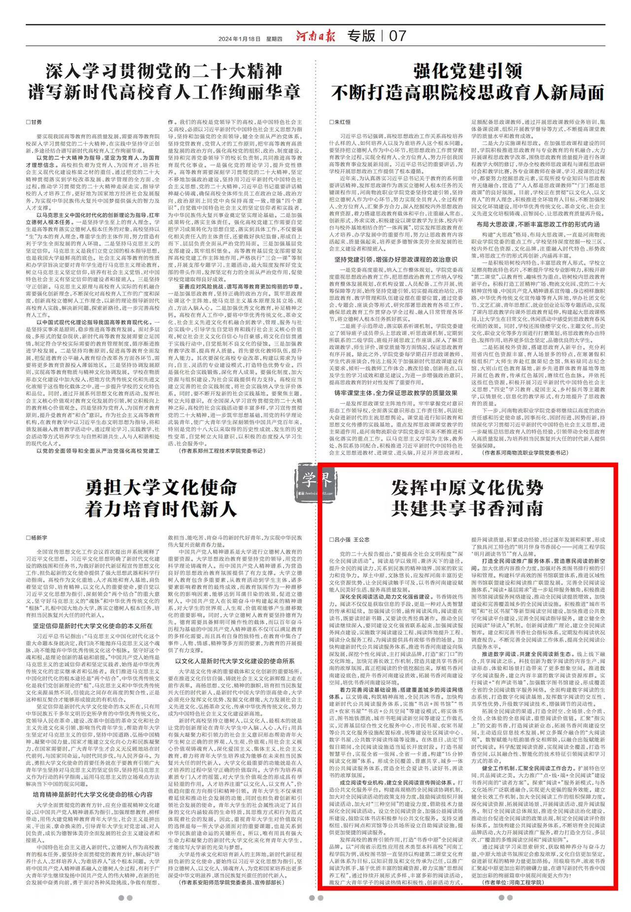 1月18日,《河南日报》学界版以《发挥中原文化优势,共建共享书香河南》为题,刊发开云官网吕小强、王公忠理论文章,该文章同时被人民日报客户端、河南日报客户端全文转载。