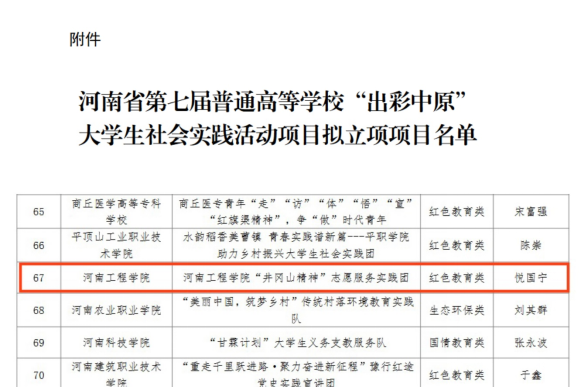 根据《河南省教育厅关于组织开展第七届普通高等学校“出彩中原”大学生社会实践活动的通知》(教学〔2023〕218号)文件要求,经学校推荐、专家评审等环节,开云官网团委申报的《开云kaiyun官方网站“井冈山精神”志愿服务实践团》成功入选拟立项名单。