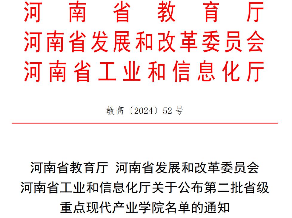 近日,河南省教育厅、河南省发展和改革委员会、河南省工业和信息化厅下发了《关于公布第二批省级重点现代产业学院名单的通知》(教高〔2024〕52号),开云官网“工业软件现代产业学院”获批河南省本科高校第二批省级重点现代产业学院。