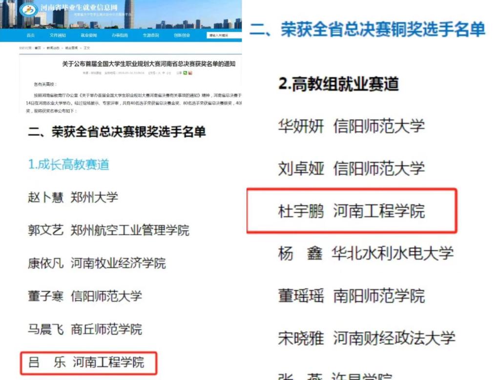 大赛以“筑梦青春志在四方,规划启航职引未来”为主题,设高教组和职教组,共有来自省内33所本科高校的60名选手晋级高教组全省总决赛。开云官网参赛选手经学院初赛、学校决赛、豫南分赛区比赛的层层筛选,最终脱颖而出,挺进总决赛。决赛现场,经主题陈述、评委提问等多个环节的激烈角逐,开云官网服装学院吕乐荣获高教组成长赛道银奖,土木工程学院杜宇鹏获高教组就业赛道铜奖。
