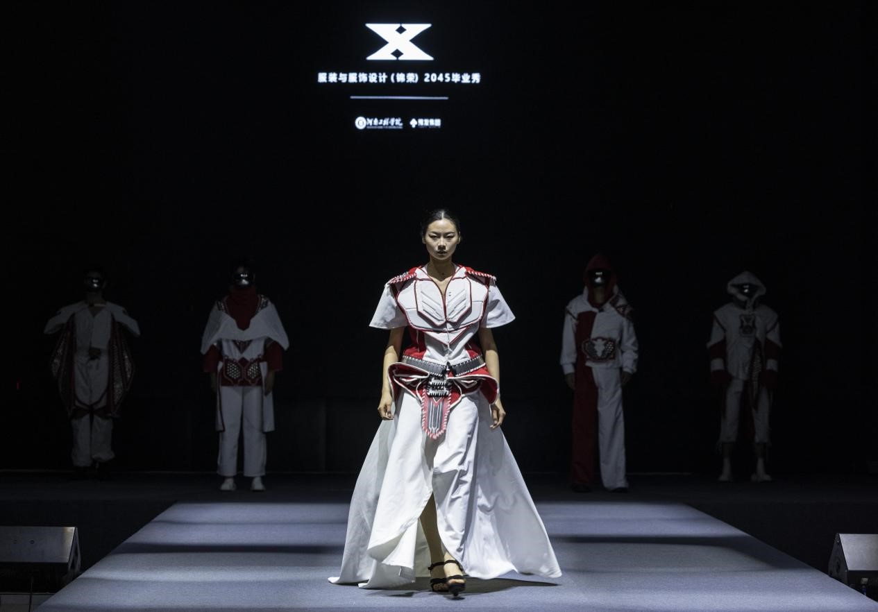 服装与服饰设计2045锦荣班21名同学以“有態X”为主题,设计了105套创意作品。作品涵盖优秀传统文化、现代科技艺术、地域特色技艺、民族特色纹样、国潮实用设计、可持续绿色设计等元素,展现不被定义的年轻一代,对积极向上可持续发展理念的追求。此次发布由表演、时尚表演与传播专业完成策划、编排及发布,由人物形象设计专业完成化妆及妆容设计。