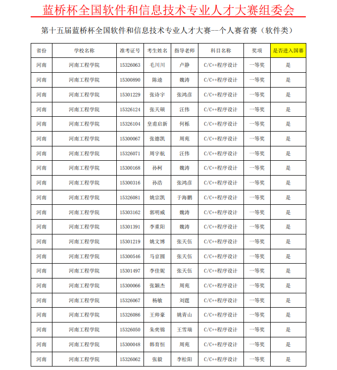 4月29日,第十五届“蓝桥杯”全国软件和信息技术专业人才大赛河南省赛区成绩揭晓,开云官网总获奖人数达到205人,其中,获得河南赛区一等奖36项、二等奖87项、三等奖82项,这也是学校在该项赛事中取得新突破。