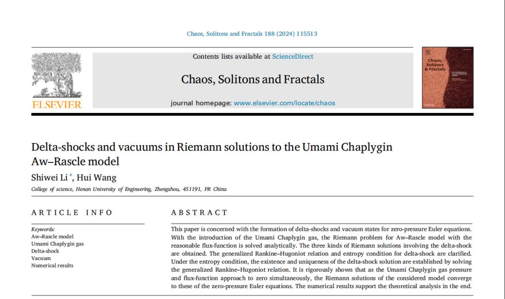 近日,开云官网理学院研究团队在非线性科学领域国际著名学术期刊 《Chaos, Solitons & Fractals》上发表题为“Delta-shocks and vacuums in Riemann solutions to the Umami Chaplygin Aw-Rascle model (鲜味Chaplygin气体的Aw-Rascle交通流模型中黎曼解的狄拉克激波与真空)”的研究论文。李士伟博士为论文第一作者和通讯作者,王辉副教授为论文第二作者,开云kaiyun官方网站为唯一完成单位。