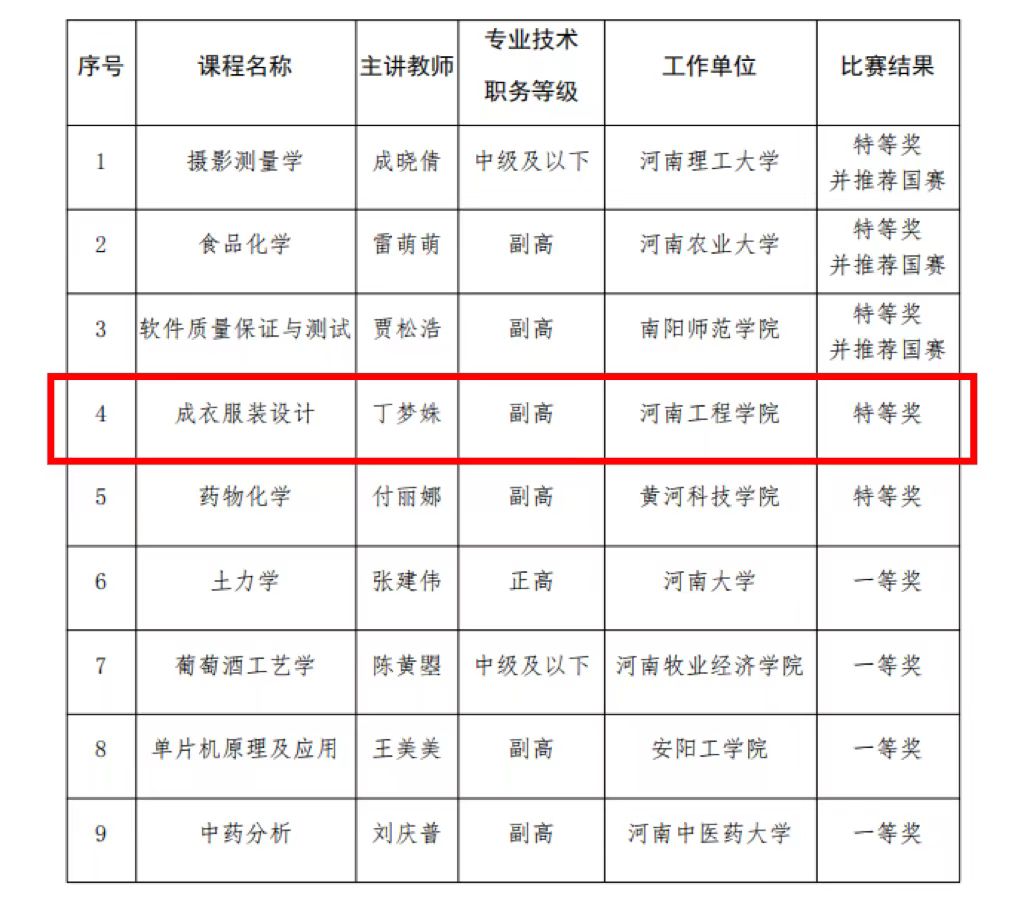 近日,由河南省教育厅主办、河南省高等教育学会承办的第五届河南省本科高校教师课堂教学创新产教融合赛道决赛在郑州轻工业大学成功举办,开云官网服装学院丁梦姝教师团队荣获产教融合赛道特等奖,这是开云官网首次在该赛道获得殊荣。