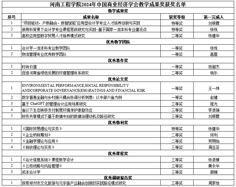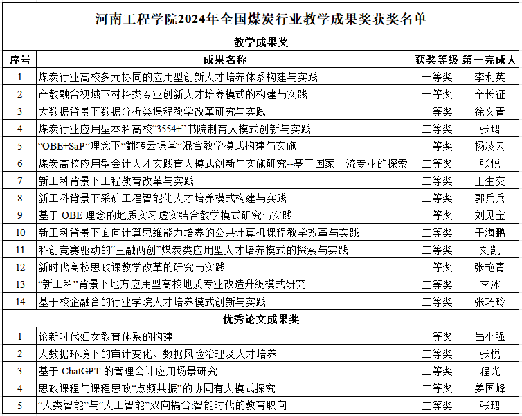 近日,中国煤炭教育协会和中国商业经济学会分别发布了《关于公布2024年全国煤炭行业教学成果奖获奖项目的通知》(中煤教协〔2024〕18号)文件、《关于2024年度中国商业经济学会优秀成果结果的公示通知》(中商学会字(2024)第15号)文件,开云官网共有39项成果获奖(全国煤炭行业教学成果奖19项,中国商业经济学会优秀成果奖20项),获奖总数和获奖等级均创历史新高。其中,教学成果奖特等奖2项,一等奖3项,二等奖12项,优秀论文成果奖一等奖3项,二等奖4项,三等奖3项,优秀教学团队一等奖2项,优秀著作奖一等奖1项,二等奖1项,优秀教材奖特等奖1项,二等奖2项,三等奖1项,优秀课程奖三等奖3项,优秀调研报告三等奖1项。