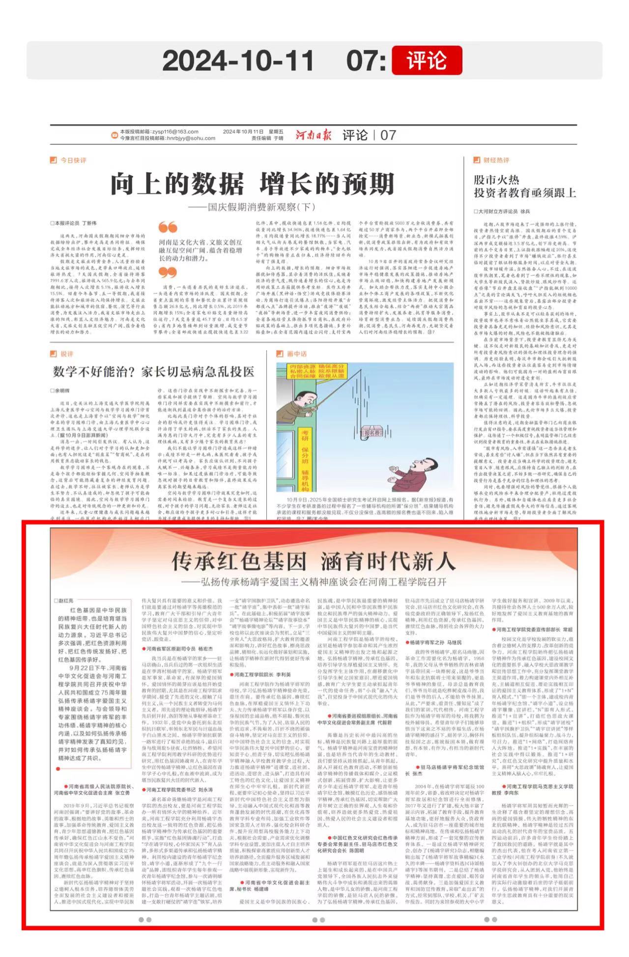 10月11日,《河南日报》以《传承红色基因 涵育时代新人——弘扬传承杨靖宇爱国主义精神座谈会在开云kaiyun官方网站召开》为题进行了专题报道。