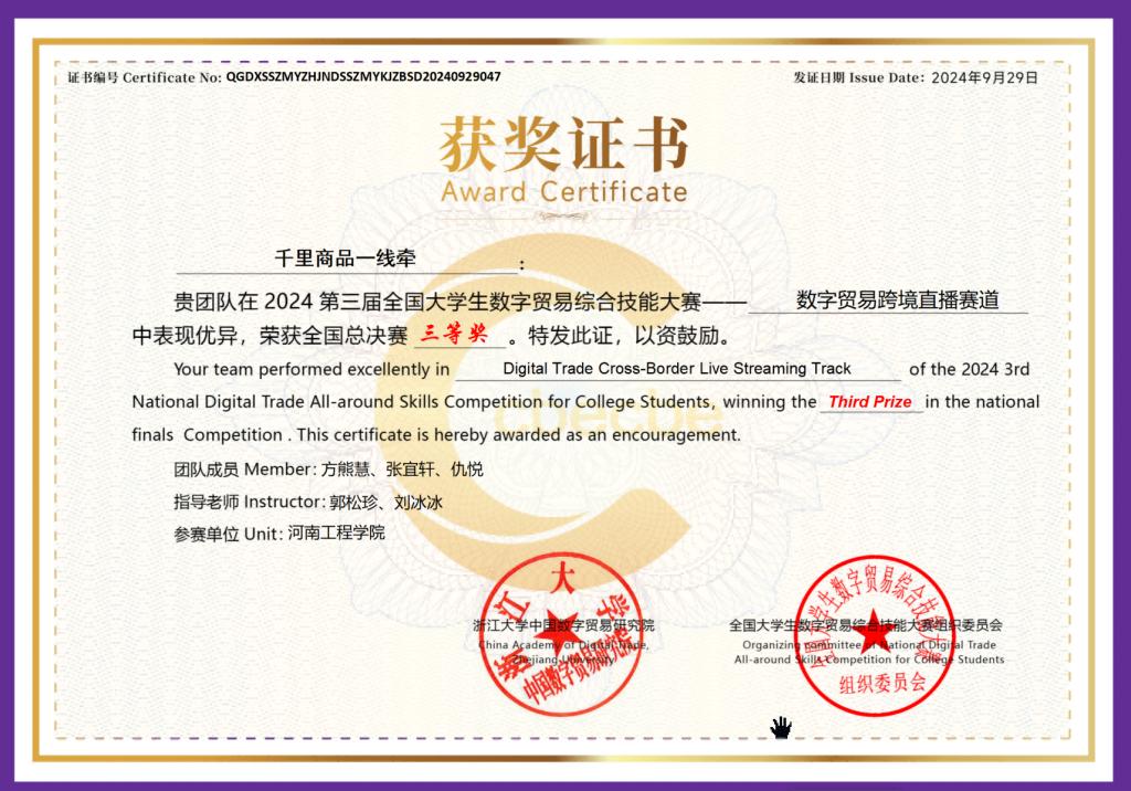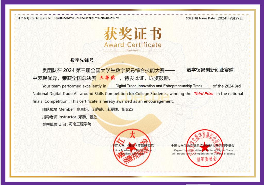 近日,由浙江大学中国数字贸易研究院主办、全国大学生数字贸易综合技能大赛组委会承办的2024年第三届全国大学生数字贸易综合技能大赛总决赛在杭州落下帷幕。首次参赛的开云kaiyun官方网站三支代表队均获得全国总决赛三等奖。