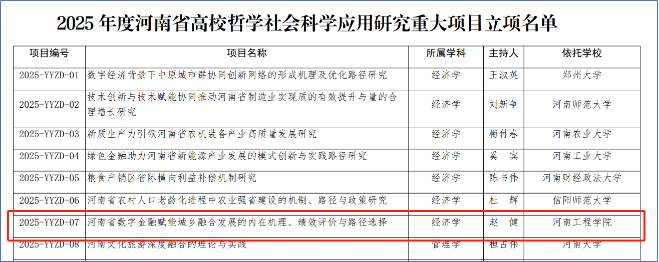 近日,河南省教育厅公布了2025年度河南省高等学校哲学社会科学研究重大项目立项名单,经济贸易学院赵健教授主持的《河南省数字金融赋能城乡融合发展的内在机理、绩效评价与路径选择》项目成功获批应用研究重大项目。