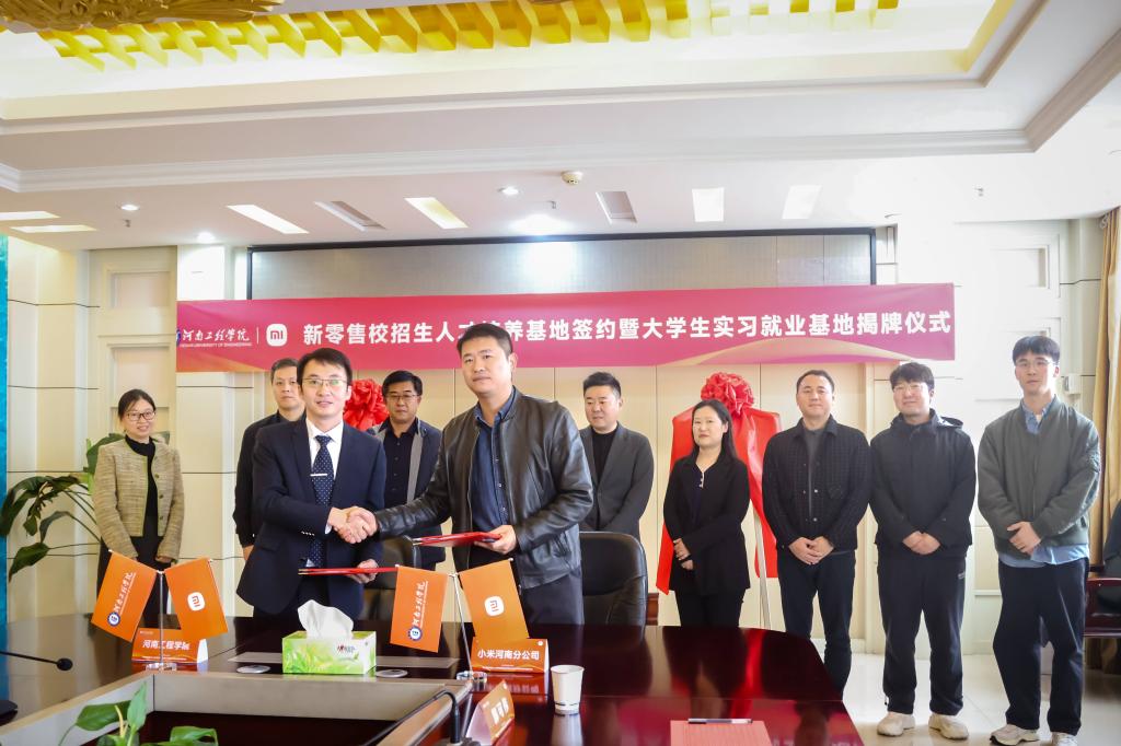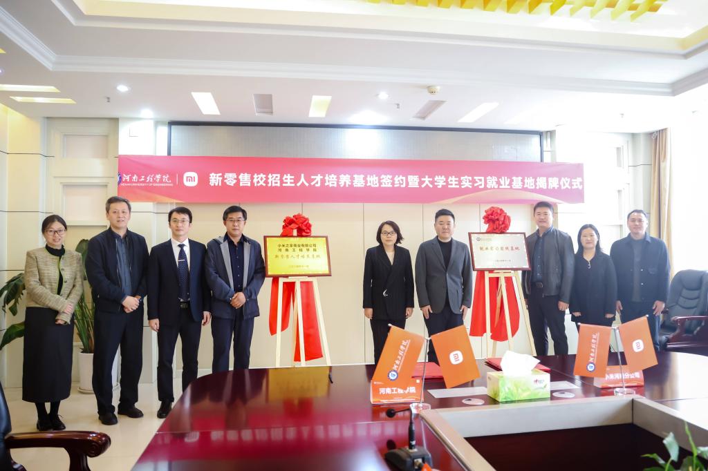 在与会嘉宾的共同见证下,管理工程学院与小米集团签署了新零售人才培养基地合作协议,副校长张巧玲与小米河南区总经理程光共同为大学生实习就业基地揭牌。