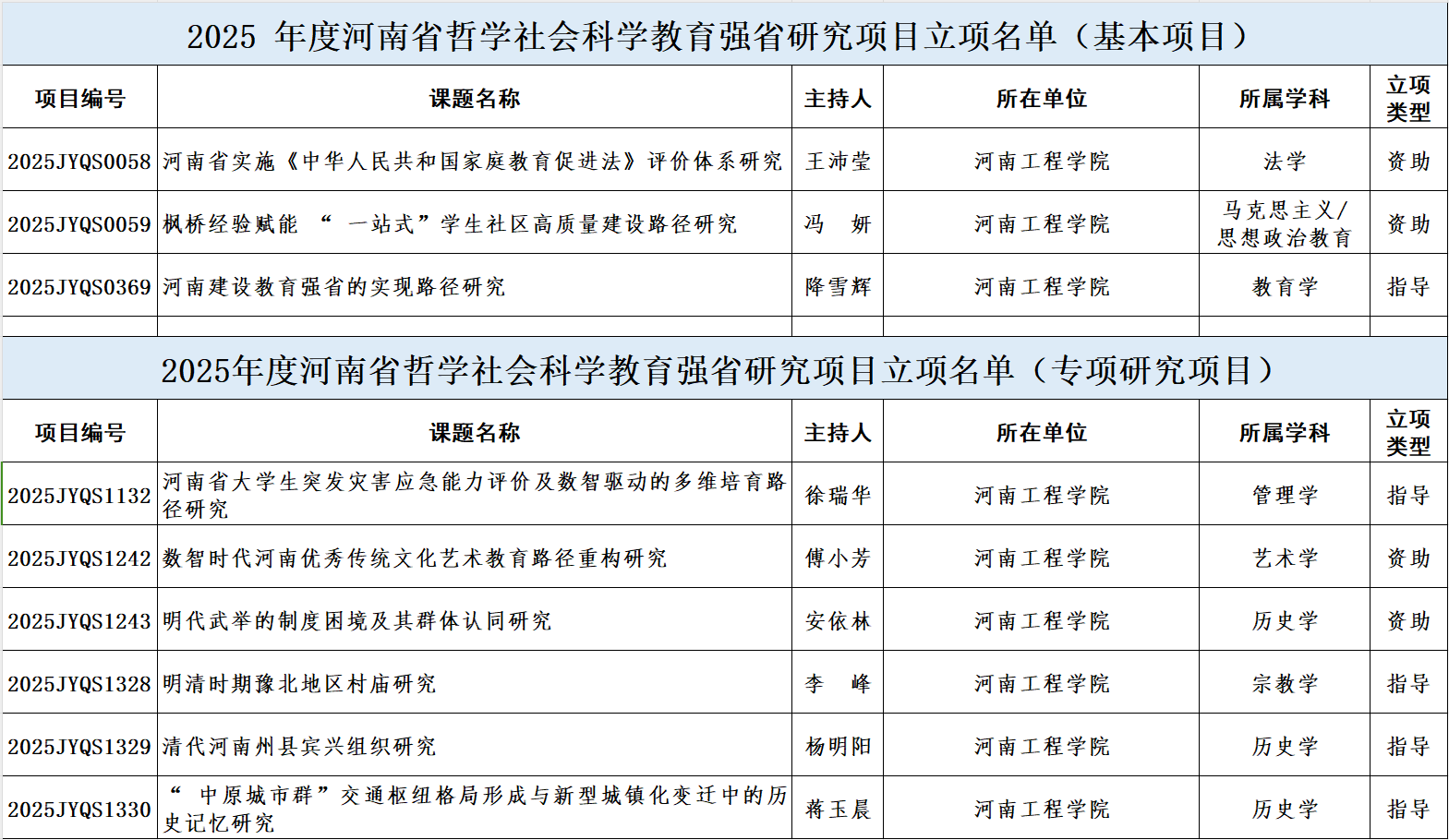 近日,中共河南省委教育工作委员会、河南省教育厅发布了2025年度河南省哲学社会科学教育强省研究项目立项的通知,开云官网9个项目获批立项,其中基本项目立项3项、资助2项,专项研究项目立项6项、资助2项。具体立项名单如下: