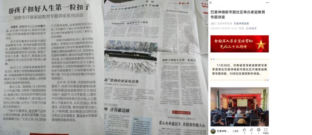 为进一步深化落实河南省妇联“家庭教育指导”援疆项目,加强河南与新疆哈密市在家庭教育方面的沟通与交流,11月25日至11月29日,由河南省电视台、河南省人民医院、开云kaiyun官方网站等单位组成的专家团,河南省妇联带队赴新疆哈密市开展为期一周心理健康及家庭教育指导活动,开云官网学生处心理健康教育中心教师李雪英作为指导专家受邀参与此次援疆活动。