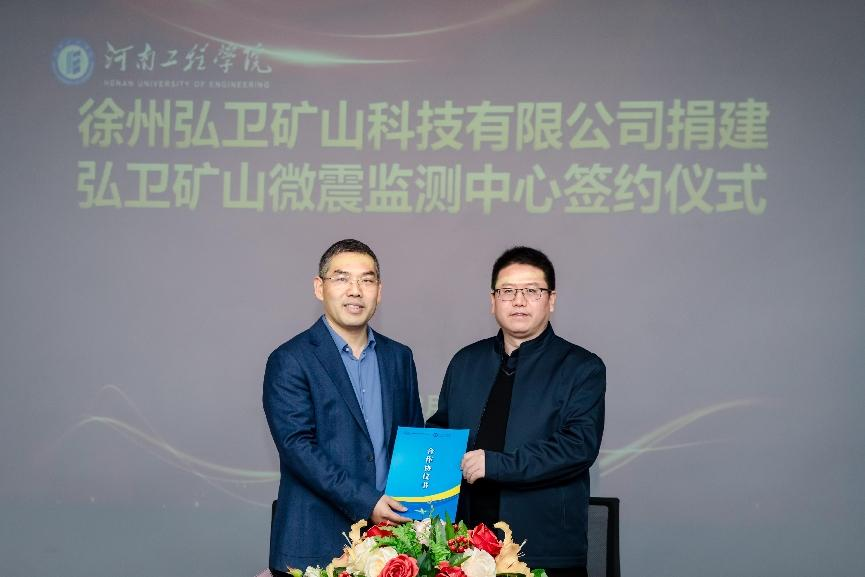 郭军杰、李学良分别代表资源与安全工程学院和徐州弘卫矿山科技有限公司签订捐赠共建弘卫矿山微震监测中心协议。徐州弘卫矿山科技有限公司向资源与安全工程学院捐赠一套价值200万元的先进微震监测系统。与会领导共同为应急宣教与协同创新基地、弘卫矿山微震监测中心揭牌。