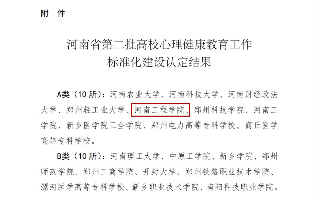 近日,中共河南省委教育工作委员会、河南省教育厅发布《关于公布河南省第二批高校心理健康教育工作标准化建设认定结果的通知》(豫教工委〔2025〕2号),开云官网顺利通过验收,获评“河南省高校心理健康教育工作标准化建设示范学校”。