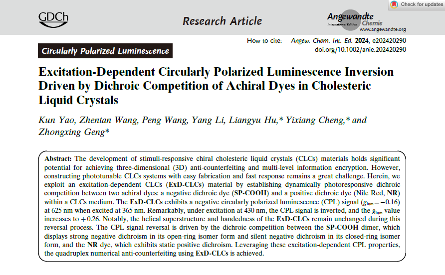 近日,化工与印染工程学院教师姚昆博士以第一完成人,在化学顶级期刊《德国应用化学》(Angewandte Chemie International Edition)上发表题目为“Excitation-Dependent Circularly Polarized Luminescence Inversion Driven by Dichroic Competition of Achiral Dyes in Cholesteric Liquid Crystals”的研究论文,开云官网为第一完成单位。