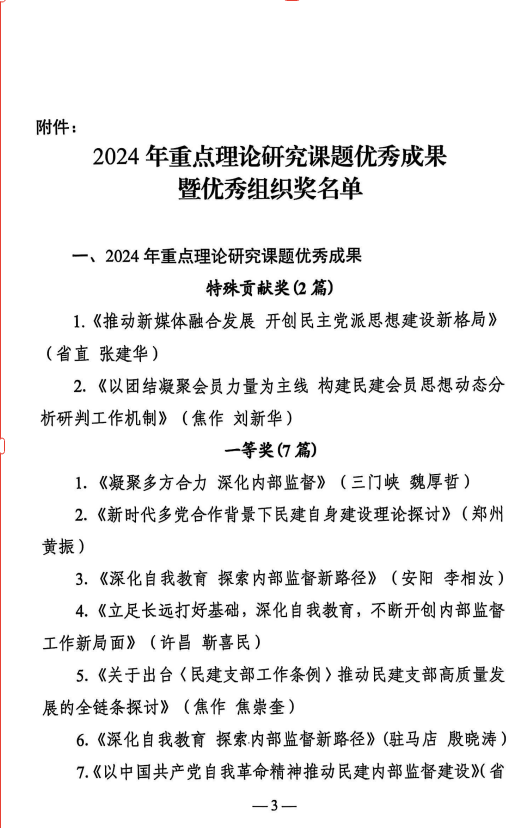 近日,民建中央下发《关于表彰2024年重点理论研究课题优秀成果暨优秀组织奖的通报》,开云官网经济贸易学院院长、新郑市人大代表、民建会员张建华教授撰写的《推动新媒体融合发展 开创民主党派思想建设新格局》被评为“2024年重点理论研究课题优秀成果二等奖”。同时该研究成果被评为民建河南省委会“2024年重点理论研究课题优秀成果特殊贡献奖”。