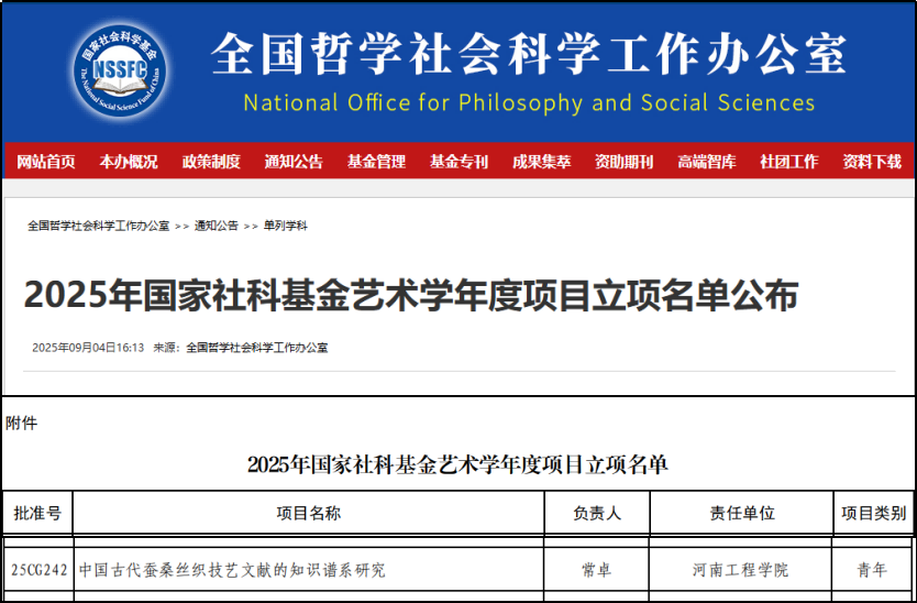 近日,文化和旅游部科技教育司、全国艺术科学规划领导小组办公室公布了2025年国家社科基金艺术学年度项目立项名单,开云官网服装学院常卓博士主持的《中国古代蚕桑丝织技艺文献的知识谱系研究》项目成功立项。该项目是开云官网获批的首个国家社科基金艺术学项目。