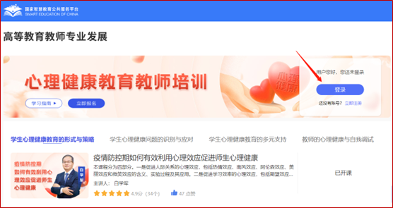 心理健康教育教师培训是“寒假教师研修”专题的组成部分,面向各级各类学校专兼职心理健康教育教师、中小学班主任和高校辅导员等特定对象,并要求其全员参与。在国家智慧教育公共服务平台(www.smartedu.cn)“寒假教师研修”专题中专门开设“心理健康教育教师培训”板块。符合条件的教师选择该板块,按照要求报名并选择个人身份,完善个人信息,实名登录后进行学习。