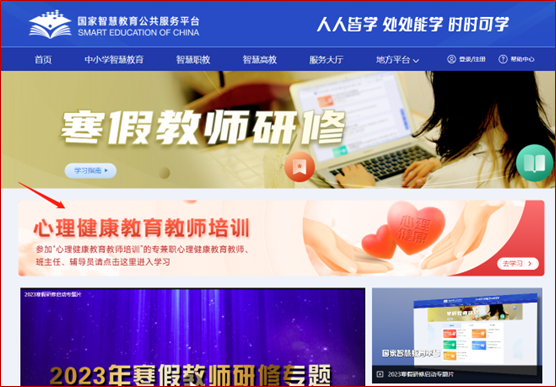 第二步:进入“寒假教师研修”专题后,选择心理健康教育教师培训。