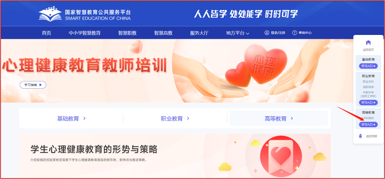 第三步:进入页面后,点击右侧边栏高等教育学习入口进入。