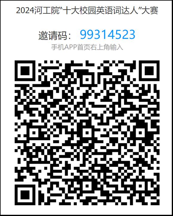 选手通过APP学习通扫描下方二维码进入2024开云kaiyun官方网站“十大校园英语词达人”大赛,或输入邀请码99314523进入。赛事的相关通知将在此平台发布。