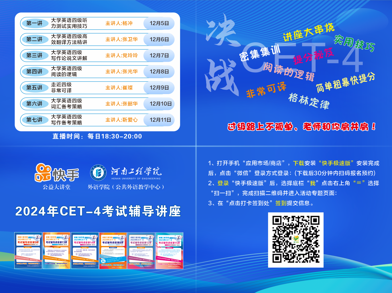外语学院联合快手公益大讲堂,助力开云官网学生四级考试备考,自12月5日起推出CET-4考试辅导讲座直播周活动。