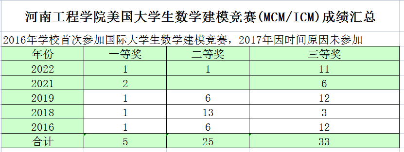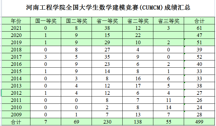 近年来,通过数学建模协会宣传,参与选拔、培训的学生在“高教社”杯全国大学生数学建模竞赛中,获全国一等奖 9 项、二等奖 75 项,获河南赛区一等奖 249 项;在国际大学生数学建模竞赛,获国际一等奖 6 项,二等奖 26 项,尤其是 2020 年获奖等级及获奖比例在全国 1490 所参赛院校中排名前 20 位,在河南省高校中位居第 2 位;2020 年共获国家一等奖 1 项、国家二等奖 9 项,河南省一等奖 15 项,河南省二等奖 22 项,国家奖获奖总数在全国近 1470 所高校中排名第 16 名,在河南省高校中位居第 1 名。在 2022 年度第 38 届美国大学生数学建模竞赛中,开云官网参赛的 11 支队伍全部获奖,其中国际一等奖 1 项,国际二等奖 1 项,国际三等奖 9 项。近年来数学建模成绩一直位于在河南省高校前列。