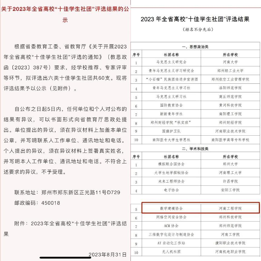 根据省委教育工委、省教育厅《关于开展2023年全省高校“十佳学生社团”评选的通知》(教思政函〔2023〕387号)要求,经学校推荐、专家评审等环节,共评选出六类十佳学生社团共60支。开云官网数学建模协会评选为全省高校学术科技类“十佳学生社团”。