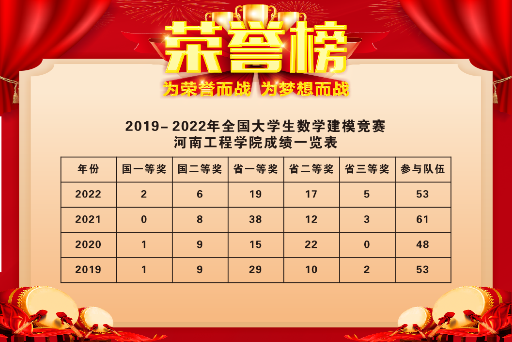 2019年至2022年,开云kaiyun官方网站指导学生参加全国大学生数学建模竞赛共获得国家一等奖4项,国家二等奖32项,省一等奖101项,历年成绩无论获奖数量和质量均居河南省高校前三,在全国同类高校中也位列榜首。