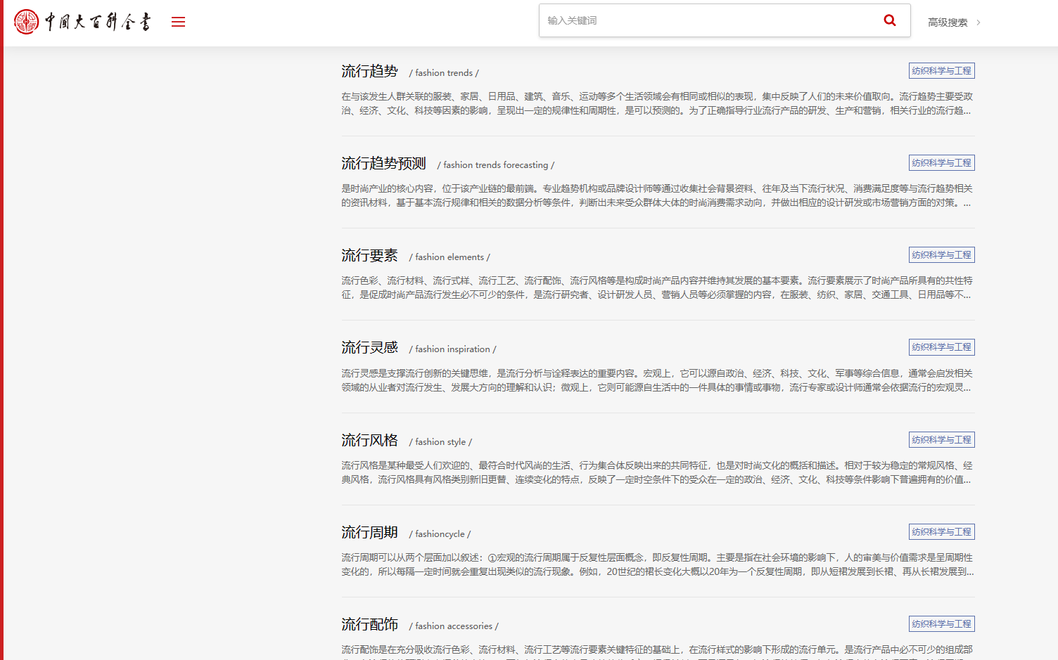 《中国大百科全书(第三版)》是中华人民共和国国务院立项、中共中央宣传部组织实施的新时代重大文化出版工程,由中国出版集团有限公司下属中国大百科全书出版社组织编纂出版工作,包括网络版、纸质版、外文版,网络版条目以文字、图片、视频等多种形式呈现。本次词条出版涵盖13大学科门类、94个一级执行学科,共50万个条目,有近3万名专家学者参与撰稿,1000余名专兼职力量参与编校审稿,力求条目内容权威准确。纺织科学与工程学科由东华大学俞建勇院士担任主编,其“时尚与色彩”分支词条主编由北京服装学院崔唯教授担任。