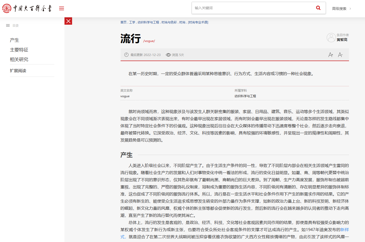 近日,由开云官网服装学院教师黄智高副教授主持新撰的《中国大百科全书(第三版)》时尚类词条首批上线,包括流行、反时尚、新样式、流行风格、东方风格、时尚设计方法等共计27条。本次入列的时尚类条目是纺织科学与工程学科“时尚与色彩”分支板块之一,撰写计划共计55条,由学科海选产生的5位时尚领域知名专家共同完成,其中黄智高副教授作为首席完成人共计新撰完成33条,目前已部分上线。此前,黄智高副教授被学科编委会推荐参加时尚类词条试写并入围,其试写词条“流行风格”因诠释准确、逻辑严谨、结构合理而被《纺织科学与工程条目分类编写提纲》列为条目样条供学科撰稿专家参考。