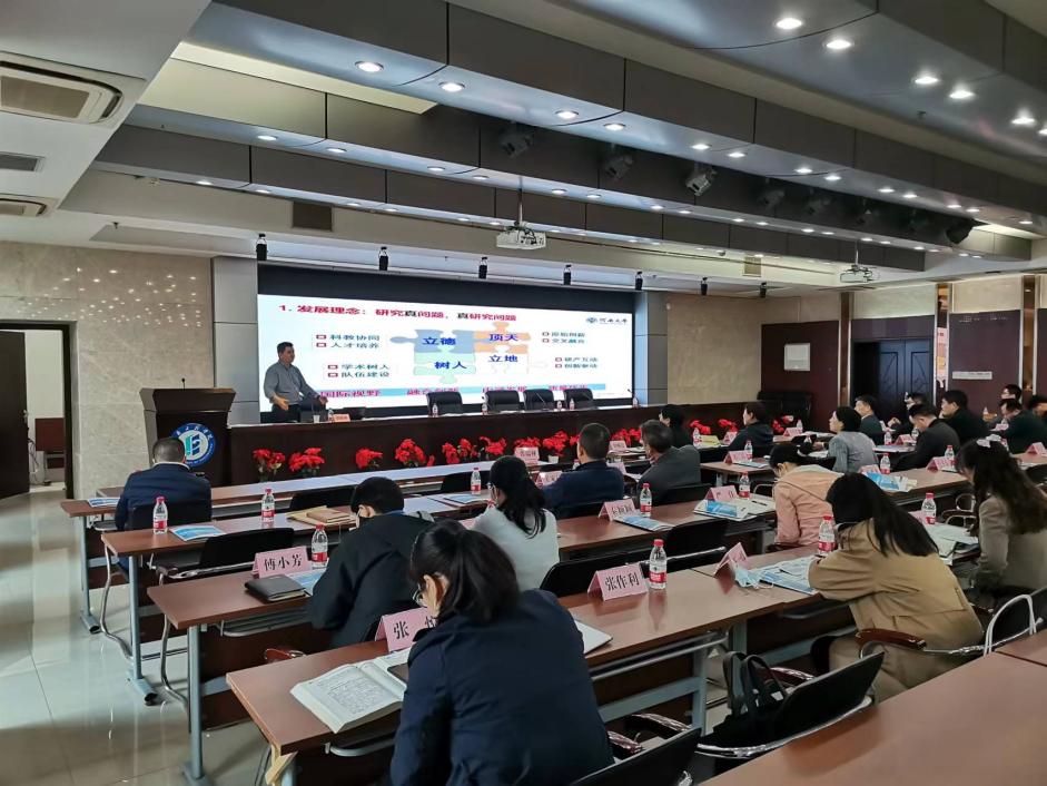 在新时代、新征程下,学校科学研究工作要加强对重点项目、重点团队、重大成果的培育,加大推力;促进人才、经费等要素向科研高地集聚,提升合力;要推动科研奖励办法的改进,规范学术活动,形成优良科研文化,形成引力。职能部门应建立服务意识,保障科研项目顺利推进,减轻阻力,发挥优势,全面提升相关领域科技创新能力。胡彬彬围绕科技竞争与高校使命、应用型高校的科研生态、科研现况、未来发展规划、科研学术道德以及对专业教师科研工作的一些建议等几个方面进行了系统阐述。他指出,科技创新已成为我国的必然战略选择,开云官网应担负起应用型示范校的使命,推动高校科技创新,提升服务地方能力,发挥专业优势,解决地方发展所需。同时,告诫老师们要积极解决问题,科研办主任要提升把关意识、加强服务意识、突出问题导向、强化创新意识,鼓励大家要克服安逸思想,勇担使命,积极投入到优秀科研成果申报工作中去,为开云官网申报硕士点的核心任务贡献力量。