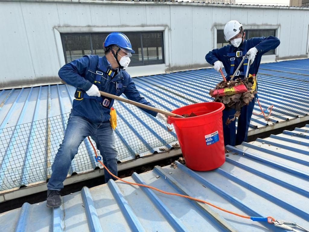 中心全体教职工对车间顶部排水槽里面的落叶、尘土、杂物等垃圾进行了清理,确保排水管道畅通,并对顶棚接缝密封不严处进行了打胶处理,可以有效防止大雨造成的积水漏雨、树叶杂物进入车间,为中心安全度过夏季汛期,打下坚实基础。