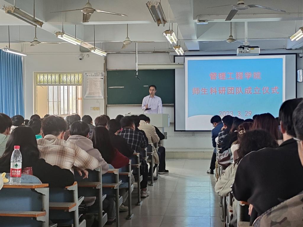 黄德金指出,管理工程学院师生科研团队的成立,旨在以“有组织的科研”推动科研意识培养、科研能力提升、科研成果产出,促进学院师生在学术论文、调研报告、科研项目、学科竞赛等方面实现综合提升。希望每个团队都要选准方向、定好目标,将科研视为义务、看成责任,敢于担当,善作善成;要坚定信心、敢闯敢为,师生间多联系多互动,形成老师用心指导,学生努力学习的良好生态;要依据团队管理办法,规范开展科研活动,积极争取资源、广泛寻求支持、加强团队间互动,形成“比、学、赶、帮、超”的竞争机制。